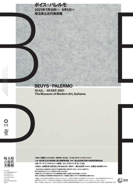 第二次世界大戦以降の最も重要な芸術家のひとり、ヨーゼフ・ボイス(1921-1986)。彼は「ほんとうの資本とは人の持つ創造性である」と語り、ひろく社会を彫刻ととらえ社会全体の変革を企てました。本展では60年代の最重要作品である《ユーラシアの杖》をはじめ、脂肪やフェルトを用いた作品、「アクション」の映像やドローイングなど、彼の作品の造形的な力と芸術的実践にあらためて着目します。 ボイスは教育者として多くの芸術家を育成したことでも知られています。ブリンキー・パレルモ(1943-1977)もその教え子のひとりです。この早世の画家が60年代半ばからの短い活動期間に残したささやかで抽象的な作品は、絵画の構成要素を再構築しながら、色彩やかたちの体験をとおして私たちの認識や社会的な制度に静かな揺らぎをもたらそうとするものでした。 一見対照的な二人のドイツ人作家の作品は、しかし、ボイスがのちにパレルモを自身にもっとも近い表現者だったと認めたように、芸術を生の営みへと取り戻そうと試みた点で共通していました。両者の1960—70年代の作品を中心に構成される本展は、約10年ぶりとなる日本でのボイス展であり、公立美術館としては初めてのパレルモ展です。 二人の作家それぞれの特徴をうかがいながら、両者の交わりや重なりに彼らの実践の潜勢力を探る本展が、社会と芸術のかかわりについてあらためて問いかけ、芸術の営為とはなにかを見つめなおす機会となることを願います。